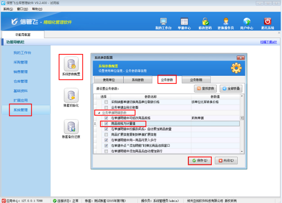 在功能導航窗點擊“系統管理”——》“系統參數配置”——》“業務參數”可以進入到“業務參數”配置界面,在業務單據明細參數中,勾選“商品規格為計量值”參數,然后保存設置,如下圖所示: