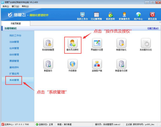 登錄軟件,在功能導航窗點擊“系統管理”—》“操作員及授權”,進入“操作員管理及授權”界面,選擇操作員“王五”,在其右側的功能模塊權限內選擇“出納查詢”模塊,將現金賬簿和銀行賬簿的“導出”權限勾選取消,然后保存設置,如下圖所示: