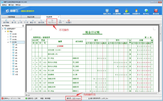 操作員權限設置完成后,使用操作員“王五”登錄軟件,點擊“出納管理”—》“現金賬簿”,打開現金賬簿界面,“導出為Excel”按鈕為灰色狀態,不可操作,如下圖所示: