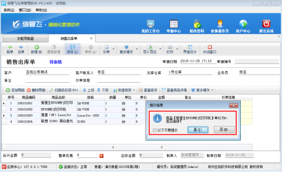 信管飛RMS、信管飛倉庫管理軟件、信管飛送貨單軟件等在業務單據保存時如果商品單價為0,系統會彈出提示信息,是否需要繼續保存,如下圖1所示,這樣以免用戶在添加商品明細時忘了填寫單價,好及時錄入,但是有一部分用戶在開單據時只需要填寫商品數量,不需要填寫單價,該怎么設置系統才能不彈出以下提示信息呢?本篇文章以信管飛倉庫管理軟件為例介紹一下如何設置出庫單保存時商品單價為0系統不彈出提示信息?