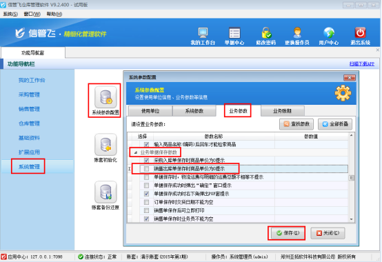 在功能導航窗點擊“系統管理”—》“系統參數配置”—》“業務參數”,即可進入到“業務參數”配置界面,在業務單據保存參數內找到“銷售出庫單保存時商品單價為0提示”參數,把這個參數的勾選去掉,然后保存設置,如下圖2所示。