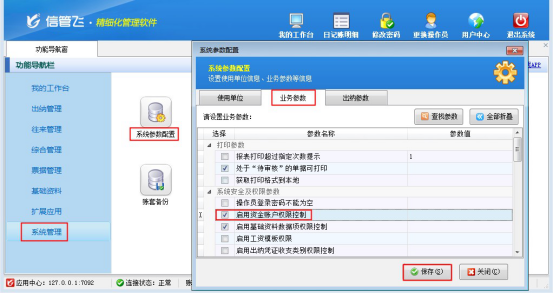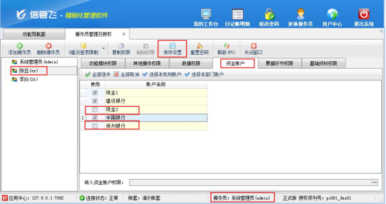 在功能導(dǎo)航窗選擇“系統(tǒng)管理”—》“系統(tǒng)參數(shù)配置”—》“業(yè)務(wù)參數(shù)”進(jìn)入業(yè)務(wù)參數(shù)配置界面,在系統(tǒng)安全及權(quán)限設(shè)置中勾選“啟用資金賬戶權(quán)限控制”參數(shù),如下圖所示:參數(shù)“啟用資金賬戶權(quán)限控制”啟用成功后,使用系統(tǒng)管理員登錄軟件,在功能導(dǎo)航窗選擇“系統(tǒng)管理”—》“操作員及授權(quán)”進(jìn)入操作員及授權(quán)管理界面,在權(quán)限模塊中可看到啟用的“資金賬戶權(quán)限”,添加操作員“張亞”,選擇操作員“張亞”后,打開(kāi)資金賬戶權(quán)限,設(shè)置操作員“張亞”沒(méi)有“現(xiàn)金2和鄭州銀行”權(quán)限,保存設(shè)置,如下圖所示: