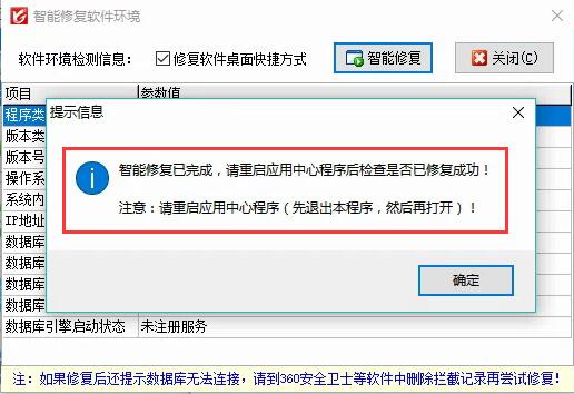 如智能修復(fù)軟件環(huán)境完成后,重啟應(yīng)用中心程序數(shù)據(jù)庫(kù)狀態(tài)仍顯示為連接失敗,請(qǐng)聯(lián)系我們?cè)诰客服解決。