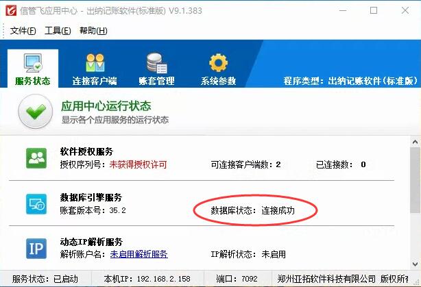 智能修復(fù)軟件環(huán)境完成后,請(qǐng)重啟應(yīng)用中心程序,然后查看下數(shù)據(jù)庫(kù)連接狀態(tài)是否顯示為連接成功(如下圖所示),數(shù)據(jù)庫(kù)狀態(tài)為連接成功,則軟件即可正常登錄。