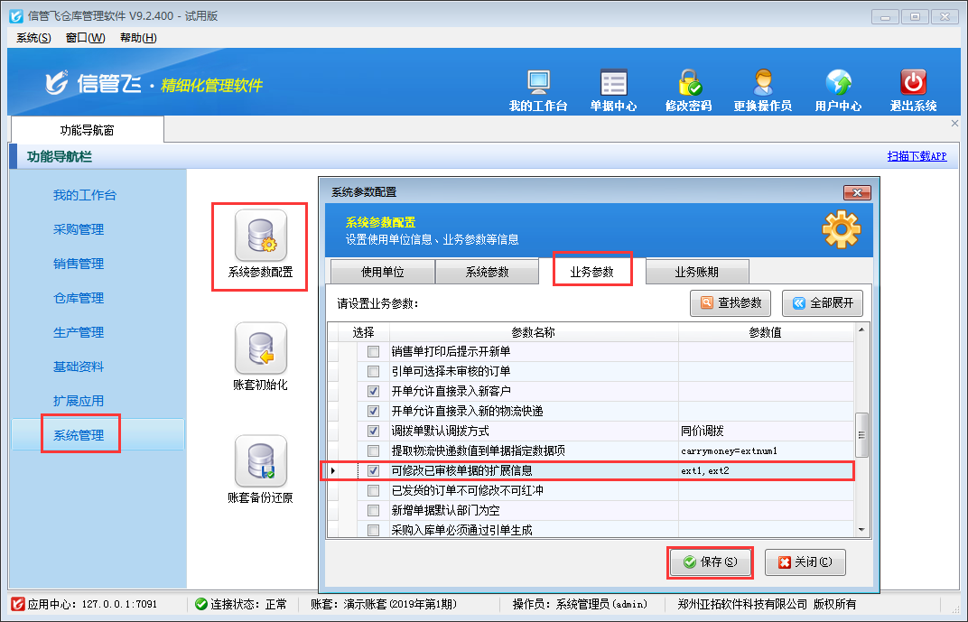 在功能導航窗點擊“系統管理”—》“系統參數設置”—》“業務參數”可以進入到“業務參數”配置界面,在業務單據相關參數內打勾啟用“可修改已審核單據的擴展信息”參數,并設置參數值(單據主體擴展信息字段名),默認為“ext1,ext2(擴展信息1,擴展信息2)”,如下圖所示。