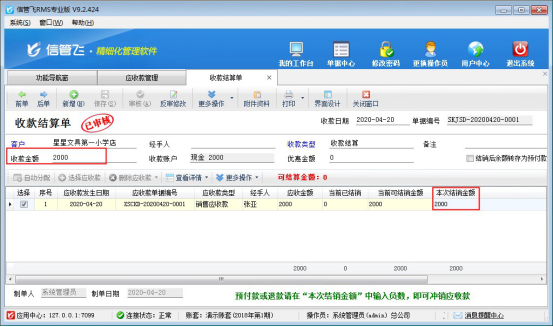 在應收款管理界面點擊“收款結算”按鈕可以打開收款結算單對應收款進行收款結算,如下圖所示,在收款結算單單據主體選擇收款賬戶后錄入“收款金額”2000元,單據明細中“本次結銷金額”錄入2000元,保存收款結算單即可。