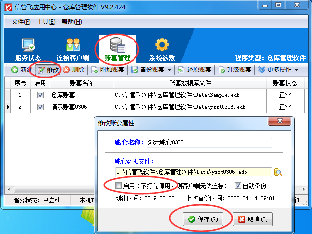 應用中心(紅色圖標)程序運行后會在電腦桌面的右下角顯示,雙擊即可打開應用中心主界面,點擊“帳套管理”,如下圖所示,帳套列表一共有兩個帳套啟用,現在我們對第二個帳套“演示賬套0306”進行停用。選擇帳套后,點擊“修改”按鈕,系統彈出修改帳套屬性窗口,把“啟用”的打勾取消,然后點擊“保存”按鈕保存配置。