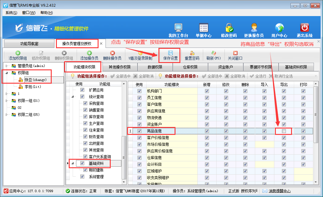 在功能導(dǎo)航窗點(diǎn)擊“系統(tǒng)管理”—》“操作員及授權(quán)”打開操作員管理及授權(quán)界面,選擇操作員“張亞”,在功能模塊權(quán)限界面,選擇“基礎(chǔ)資料”—》“商品信息”,在導(dǎo)出權(quán)限下,把商品信息“導(dǎo)出”權(quán)限勾選取消后保存權(quán)限,如下圖所示: