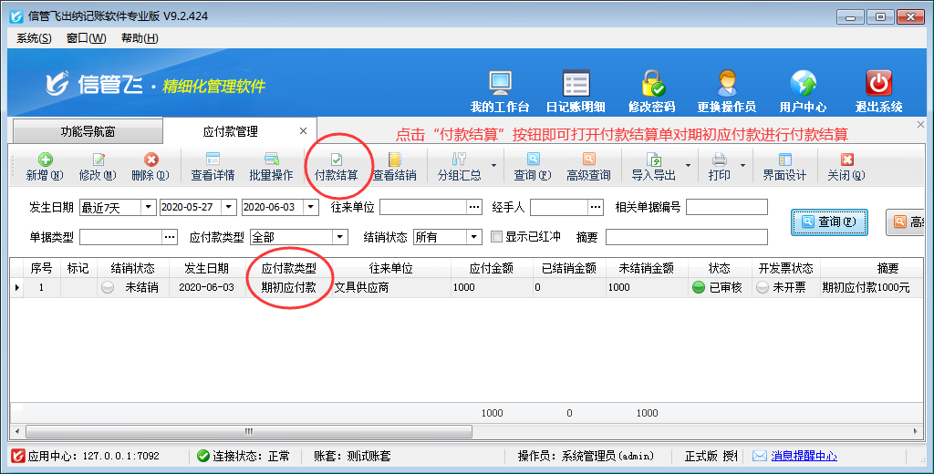 保存后,應(yīng)付款管理界面增加一條未結(jié)銷的期初應(yīng)付款記錄,后續(xù)給供應(yīng)商結(jié)款后,可以在軟件中結(jié)銷此期初應(yīng)付款,選擇此條期初應(yīng)付款記錄,然后在工具欄點擊“付款結(jié)算”按鈕即可打開付款結(jié)算單界面對期初應(yīng)付款進行付款結(jié)銷,如下圖所示: