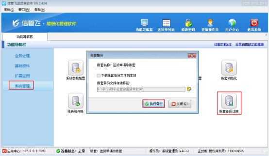 信管飛送貨單軟件、信管飛RMS軟件、信管飛出納記賬軟件等都支持網(wǎng)絡(luò)版和單機版,網(wǎng)絡(luò)版本默認需要固定一臺電腦作為主機電腦,需打開紅色應(yīng)用中心程序,客戶端電腦安裝客戶端程序,默認需要局域網(wǎng)下連接主機電腦紅色應(yīng)用中心ip地址,紅色應(yīng)用中心程序可操作賬套新增以及備份還原等,為避免主機忘記備份,客戶端電腦可直接在客戶端程序上進行執(zhí)行備份操作以及可下載備份文件到本地,本文以“信管飛送貨單軟件”為例,示范下客戶端電腦如何執(zhí)行備份及下載備份到本地。