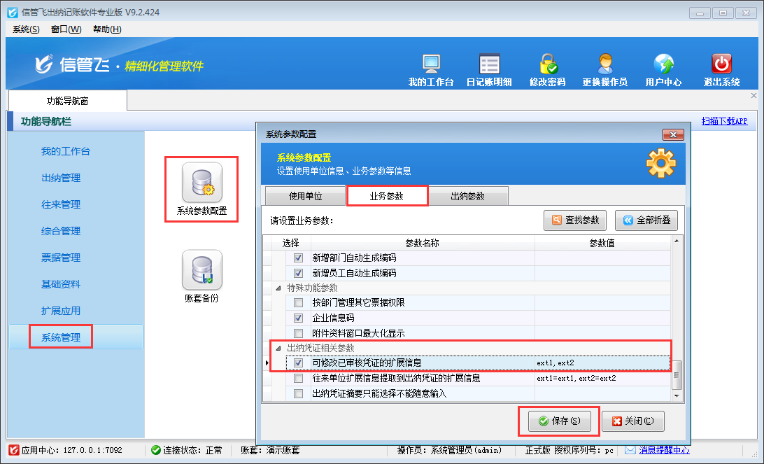 出納記賬軟件中默認(rèn)不允許直接修改已審核憑證的擴(kuò)展信息,但是如需修改已審核憑證的擴(kuò)展信息,系統(tǒng)支持參數(shù)配置,如下圖所示,啟用參數(shù):“可修改已審核憑證的擴(kuò)展信息”,參數(shù)值可自定義,默認(rèn)為“ext1,ext2(擴(kuò)展信息1,擴(kuò)展信息2)”,參數(shù)啟用后即可修改已審核憑證的擴(kuò)展信息,但是如需普通操作員可修改已審核憑證的擴(kuò)展信息,需要另外設(shè)置一下操作員權(quán)限,本文介紹一下如何設(shè)置操作員可修改已審核憑證擴(kuò)展信息的操作權(quán)限?