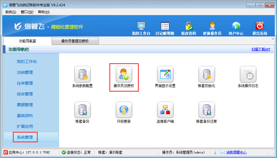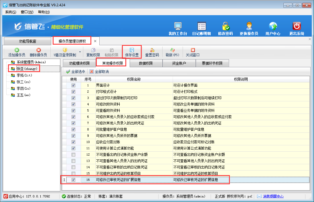 在功能導(dǎo)航窗點(diǎn)“系統(tǒng)管理”→“操作員及授權(quán)”即可進(jìn)入“操作員管理及授權(quán)”界面,選中操作員賬號(hào),在“其他操作權(quán)限”界面將“可修改已審核憑證的擴(kuò)展信息”權(quán)限勾選上,然后保存權(quán)限設(shè)置即可。如下圖所示,設(shè)置操作員賬號(hào)“張亞”可修改已審核憑證的擴(kuò)展信息。