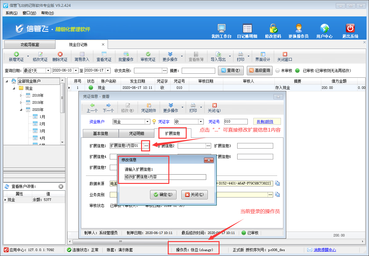 設(shè)置完成之后,我們使用操作員賬號(hào)“張亞”登陸軟件,然后在功能導(dǎo)航窗點(diǎn)擊“出納管理”→“現(xiàn)金日記賬”,打開(kāi)一個(gè)已審核的現(xiàn)金日記賬憑證,然后點(diǎn)擊擴(kuò)展信息頁(yè)面,在“擴(kuò)展信息1”后的“...”按鈕可以直接修改擴(kuò)展信息內(nèi)容,如下圖所示: