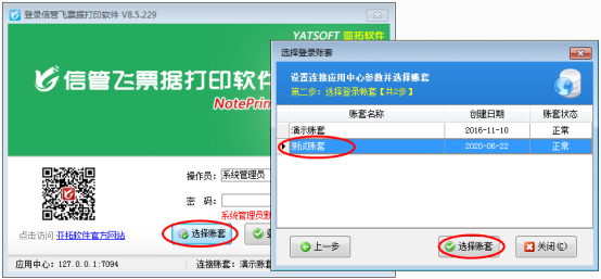 運行信管飛票據打印軟件客戶端(藍色圖標),在軟件登錄界面點擊“選擇賬套”,在“選擇登錄賬套”界面選擇我們所需要的賬套,然后登錄軟件即可。