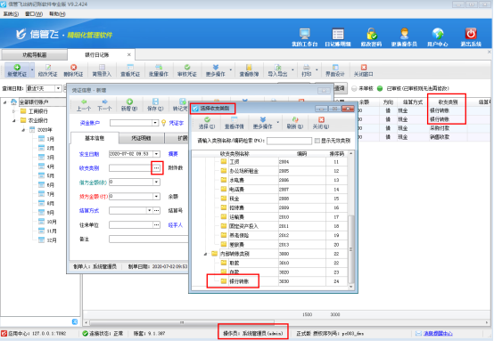 系統管理員登錄軟件后可以看到“銀行轉賬”相關的出納憑證,如圖3所示。而使用操作員“張亞”登錄軟件,日記賬列表內看不到收支類別為“銀行轉賬”的憑證記錄,新增憑證界面在選擇收支類別窗口也無法選擇到“銀行轉賬”,如下圖4所示: