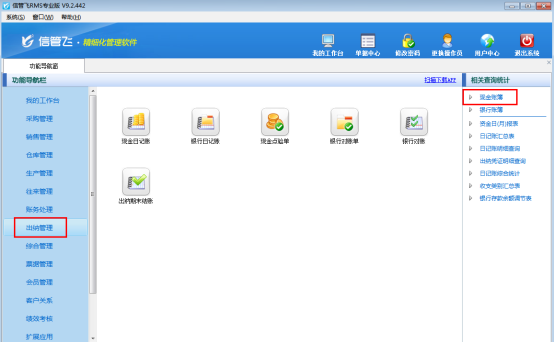 點擊功能導航窗中的“出納管理”,在界面右側“相關查詢統計”下點擊“現金賬簿”,如圖2所示。
