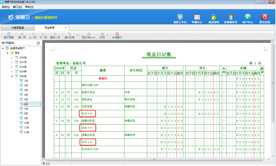 系統進入“現金賬簿”窗口,在窗口左側的導航樹中,所有現金帳戶可以按年按月顯示帳簿信息,我們點擊查看2020年6月的現金賬簿信息,如圖3所示,這是現金賬簿顯示本日小計的效果圖。