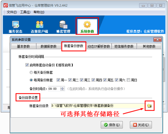 本文以信管飛倉庫管理軟件為例,介紹下如何修改賬套備份存儲目錄,打開應(yīng)用中心程序(紅色圖標(biāo)),點擊“系統(tǒng)參數(shù)”進入?yún)?shù)設(shè)置界面,選擇“賬套備份參數(shù)”,在賬套備份目錄設(shè)置中,可以修改默認(rèn)目錄,如下圖1所示: