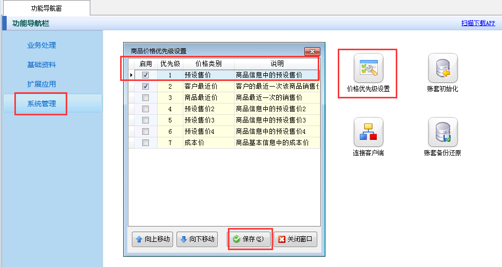 在“價格優(yōu)先級設(shè)置”窗口中打勾啟用“預(yù)設(shè)售價”,并上移至第一位,然后保存設(shè)置即可。(說明:打鉤表示生效,點擊“向上移動”和“向下移動”按鈕可以調(diào)整價格的優(yōu)先順序,系統(tǒng)按上一個價格策略沒有獲取到價格時,會自動按下一個價格策略獲取價格。)