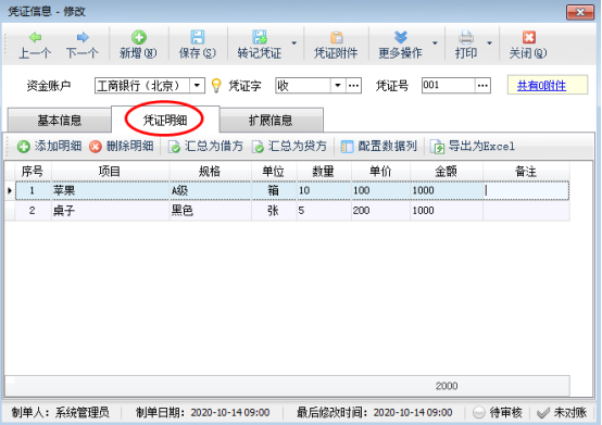 在功能導航窗點“出納管理”—》“銀行日記賬”,新增憑證界面點擊“憑證明細”,可以添加憑證明細內容,如圖1所示: