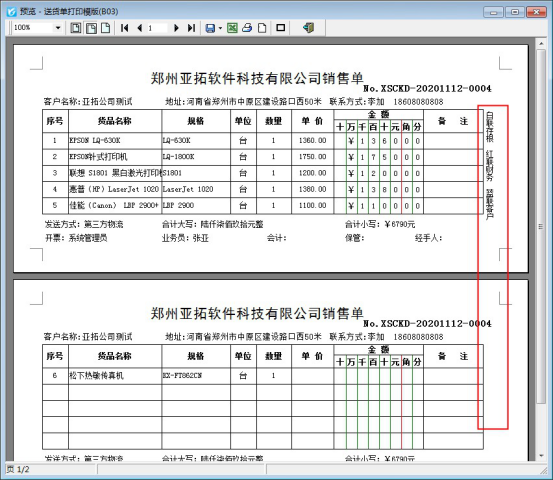 信管飛RMS軟件、信管飛送貨單軟件等都支持打印單據,打印模板支持自定義設計格式,存在多聯單支持備注多聯內容,單據開單商品過多會默認根據紙張尺寸打印多頁,有存在多聯備注在打印第二頁的時候不顯示的情況,如下圖所示: