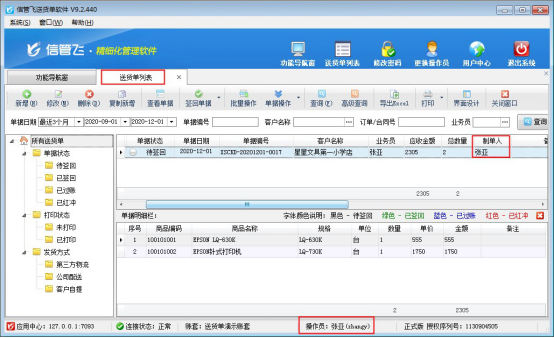 使用“系統管理員”登錄軟件,在送貨單列表中可以查看到所有人開的單據(系統管理員默認有所有權限)。如下圖所示: