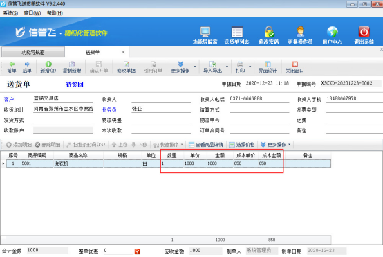 維護商品成本價之后,在功能導航窗點擊“業務處理”—》“新開送貨單”,新增一個送貨單,添加商品“洗衣機”,銷售價為1000元,然后“確認開單”保存,如圖2所示。