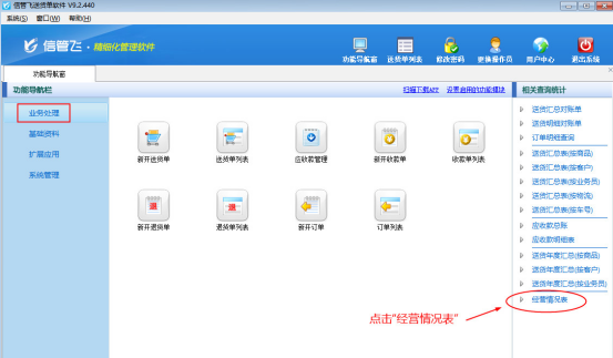 在功能導航窗點擊“業務處理”,業務處理模塊最右側是“相關查詢統計”,在相關查詢統計內點擊“經營情況表”,如圖3所示。