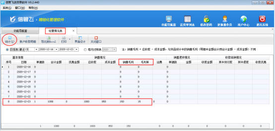 進入經營情況表界面,可以選擇日報表或每月對照表進行統計,點擊“統計”按鈕即可顯示該日期范圍內的銷售情況、退貨情況及收款結銷情況,銷售情況中包括了銷售毛利、毛利率數據。今日應收款金額為1000元,成本金額為850元,銷售毛利為150元(銷售金額-成本金額=銷售毛利),毛利率為15%(毛利率=毛利/營業收入×100%=(營業收入-營業成本)/營業收入×100% ),如圖4所示。