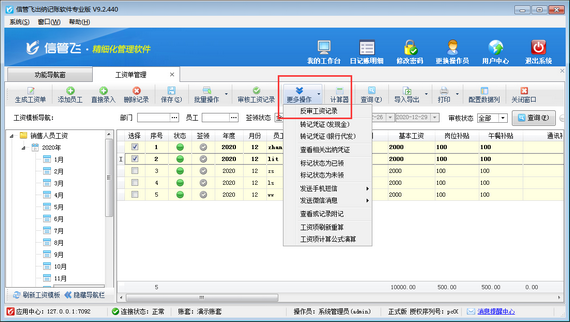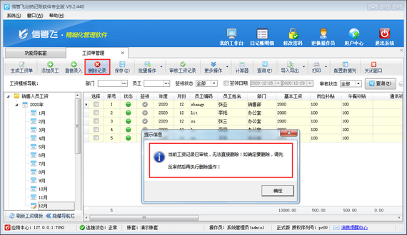 信管飛出納記賬軟件專業(yè)版包括工資管理功能,支持自定義工資模板,可根據(jù)設(shè)置的工資模板快速生成工資單,支持從上月工資單復(fù)制工資項(xiàng)目數(shù)據(jù),工資記錄審核后,無(wú)法直接刪除,如下圖所示,如確定需要?jiǎng)h除,需要反審到未審核狀態(tài),然后在執(zhí)行刪除操作,本文介紹一下出納記賬軟件中如何刪除已審核的工資記錄?