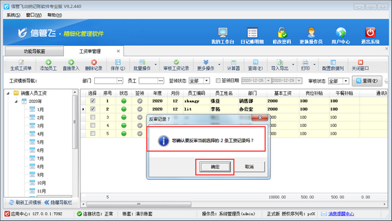 在功能導(dǎo)航窗點(diǎn)擊“綜合管理”—》“工資單管理”,打開工資單管理界面,在工資記錄列表中打鉤選擇要反審的工資記錄,然后點(diǎn)擊“更多操作”—》“反審工資記錄”,系統(tǒng)彈出提示信息“您確定要反審當(dāng)前選擇的工資記錄嗎”,如下圖所示,點(diǎn)擊“確定”按鈕確定反審工資記錄。