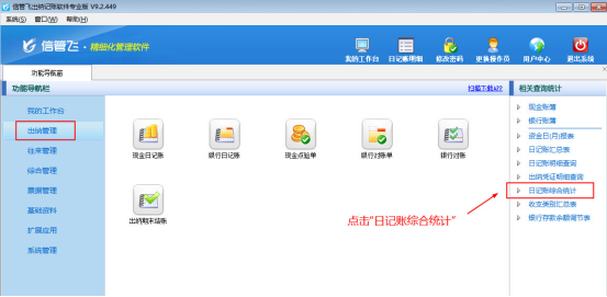 然后在“出納管理”模塊最右側(cè)的“相關(guān)查詢統(tǒng)計”內(nèi)點(diǎn)擊“日記賬綜合統(tǒng)計”,如圖2所示,系統(tǒng)打開“日記賬綜合統(tǒng)計”界面,如圖3所示。