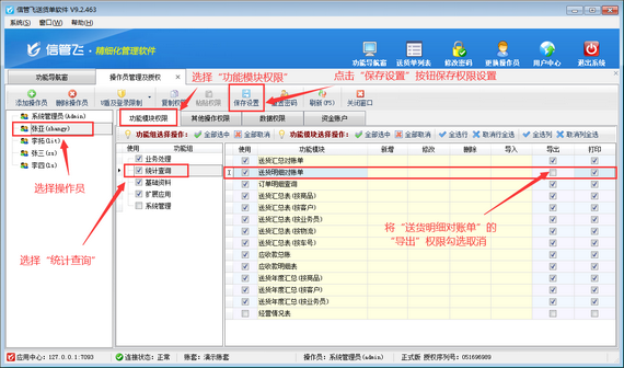 登錄軟件,在功能導航窗點擊“系統管理”—》“操作員及授權”,進入“操作員管理及授權”界面,選擇操作員“張亞”,在其右側的功能模塊權限內選擇“統計查詢”模塊,將送貨明細對賬單的“導出”權限勾選取消,然后保存設置,如下圖所示: