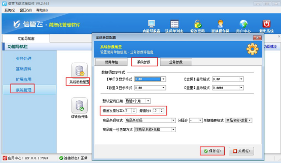 在功能導(dǎo)航窗點(diǎn)擊“系統(tǒng)管理”—》“系統(tǒng)參數(shù)配置”—》“系統(tǒng)參數(shù)”,在“系統(tǒng)參數(shù)”界面可以設(shè)置“普通發(fā)票稅率”及“增值稅發(fā)票稅率”(這里分別設(shè)置為3%及13%),設(shè)置完之后點(diǎn)擊“保存”按鈕保存配置,如下圖所示: