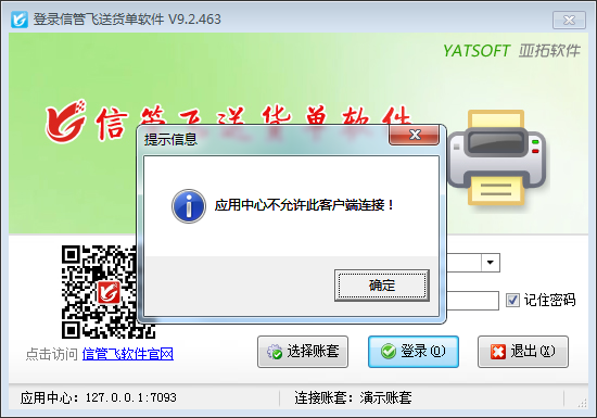 部分信管飛軟件用戶在登錄軟件時會出現軟件登錄不成功的情況,如下圖所示,系統(tǒng)彈出提示信息:應用中心不允許此客戶端連接!