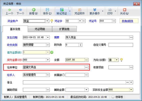 在功能導(dǎo)航窗點擊“出納管理”—》“現(xiàn)金日記賬”,新增日記賬憑證時選擇一下往來單位信息,如下圖所示。