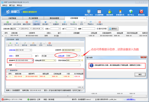 如下圖所示,員工“張偉”借款金額為5000元,費用報銷了6000元,報銷金額大于借款金額,導致欠款-1000元,需退還給員工。這種情況下,需做還款單,進行還款處理,將欠款金額清零。