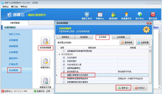 在功能導(dǎo)航窗點擊“系統(tǒng)管理”—》“系統(tǒng)參數(shù)配置”選擇“業(yè)務(wù)參數(shù)”,找到參數(shù)“銷售訂單審核允許負(fù)庫存”取消勾選,然后保存配置,如下圖所示:
