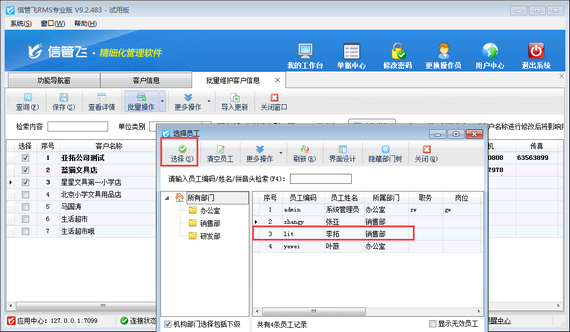 然后點擊“更多操作”—》“批量設置所屬業務員”即可,如下圖所示,批量設置選擇的客戶所屬業務員為員工“李拓”。