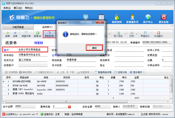 送貨單支持復(fù)制新增功能,可以選擇已確認開單的送貨單進行復(fù)制新增生成一個一模一樣的新單據(jù)。如下圖所示:
