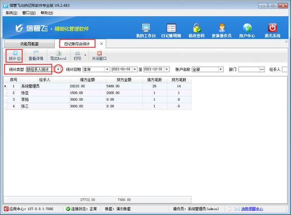 在“日記賬綜合統計”界面,統計類型選擇“按經手人統計”,然后點擊“統計”按鈕,可以根據經手人進行統計。另外,系統支持根據日期、賬戶名稱、部門、經手人等條件進行統計查詢。