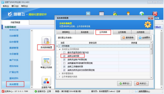 首先需要啟用下倉庫權(quán)限,在功能導(dǎo)航窗點(diǎn)擊“系統(tǒng)管理”—》“系統(tǒng)參數(shù)配置”,在“業(yè)務(wù)參數(shù)”中勾選啟用參數(shù)“啟用倉庫權(quán)限”,保存配置,如下圖所示: