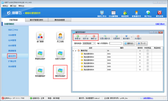 在功能導航窗點擊“基礎資料”—》“費用項目維護”即可打開“費用項目維護”窗口,如下圖所示,在“費用項目維護”窗口即可進行新增、修改、刪除常用費用項目等操作。