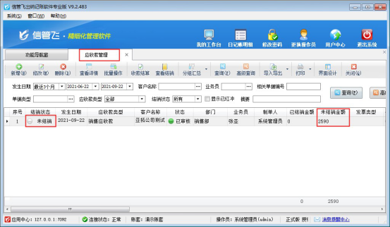 審核收款結算單后,返回至應收款管理界面,點擊“查詢”刷新,可看到結銷狀態由“未結銷”變為“部分結銷”,對應的已結銷金額變為1000元,未結銷金額為剩余的1590元,如下圖所示: