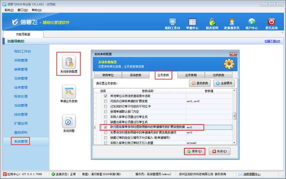 在功能導(dǎo)航窗選擇“系統(tǒng)管理”—》“系統(tǒng)參數(shù)配置”—》“業(yè)務(wù)參數(shù)”,進(jìn)入業(yè)務(wù)參數(shù)設(shè)置界面,在“業(yè)務(wù)單據(jù)相關(guān)參數(shù)”中勾選“收付款結(jié)算單保存時(shí)提取明細(xì)中的單據(jù)編號(hào)到擴(kuò)展信息數(shù)據(jù)項(xiàng)”參數(shù),并設(shè)置參數(shù)值,默認(rèn)為ext1(擴(kuò)展信息1),然后保存參數(shù)配置,如下圖所示。