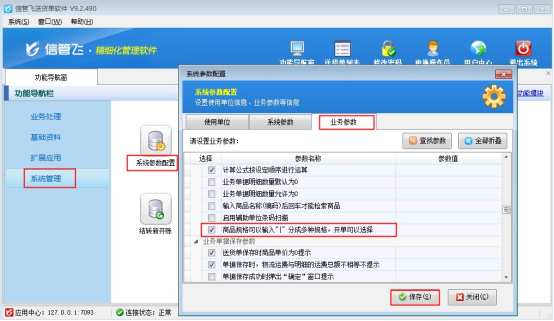 在功能導(dǎo)航窗點(diǎn)擊“系統(tǒng)管理”—》“系統(tǒng)參數(shù)配置”,勾選啟用“業(yè)務(wù)參數(shù)”中的“商品規(guī)格可以輸入”|“分成多種規(guī)格,開單可以選擇”參數(shù)。如下圖所示: