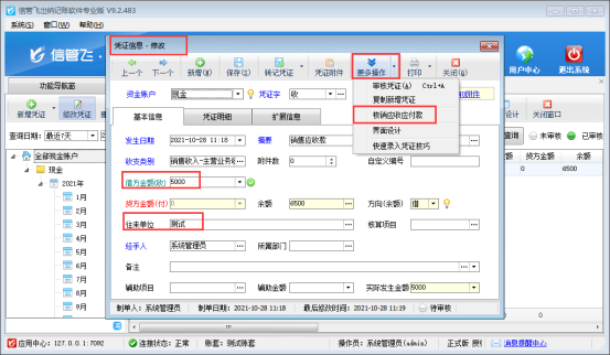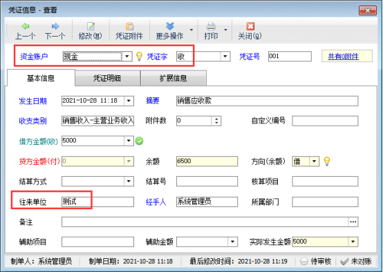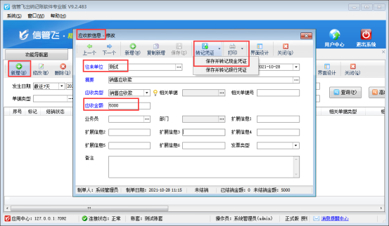 功能導(dǎo)航窗“往來管理”—》“應(yīng)收款管理”中,新增一筆客戶“測試”的應(yīng)收款記錄,應(yīng)收金額5000元,保存并轉(zhuǎn)記現(xiàn)金憑證,如下圖所示: