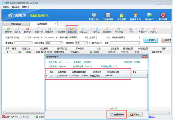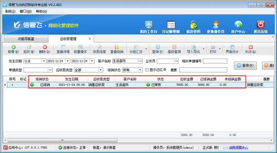 如下圖所示,客戶“生活超市”應收款5000元已結銷完畢,結銷后發現結銷錯誤,需要刪除,將應收款結銷狀態恢復到“未結銷”狀態。