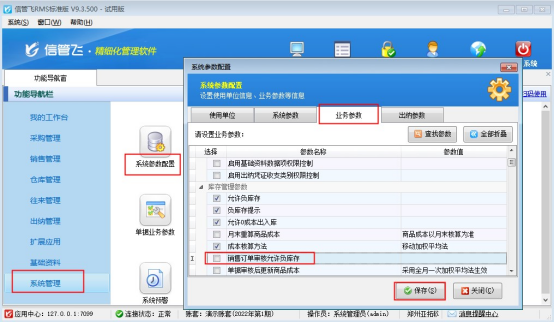 在功能導(dǎo)航窗點(diǎn)擊“系統(tǒng)管理”—》“系統(tǒng)參數(shù)配置”選擇“業(yè)務(wù)參數(shù)”,找到參數(shù)“銷售訂單審核允許負(fù)庫(kù)存”取消勾選,然后保存配置,如下圖所示: