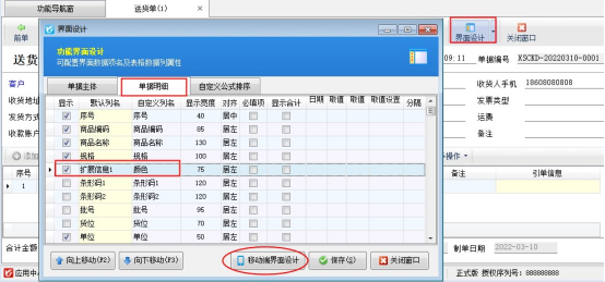 微信端界面設計需要在電腦端的開單界面界面設計中“移動端界面設計”中配置。打開電腦端軟件界面設計,選擇移動端界面設計,進入APP設計界面,勾選單據明細“擴展信息1”可向上移動到規格數據項后邊,然后保存配置,如下圖所示: